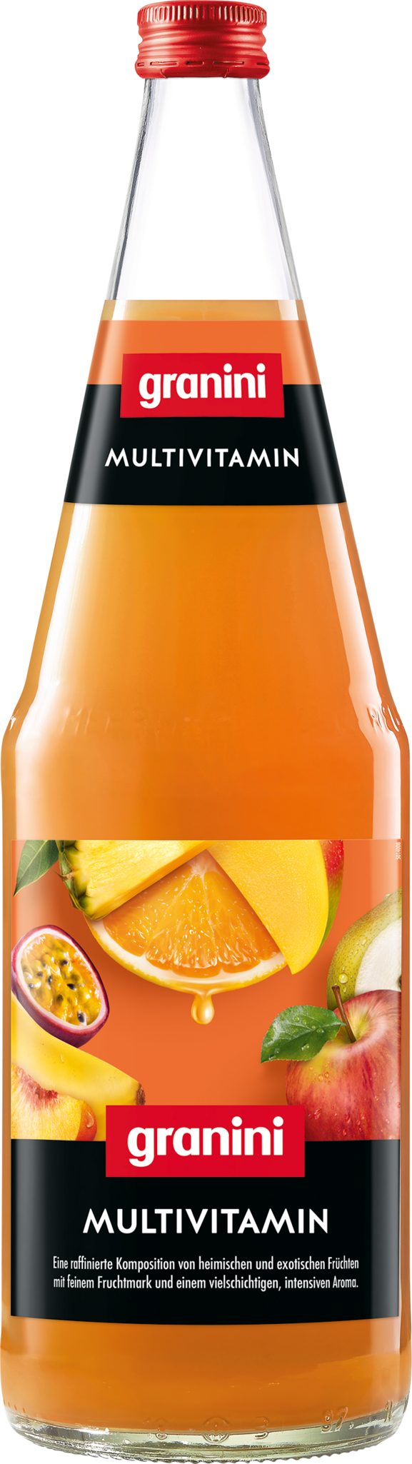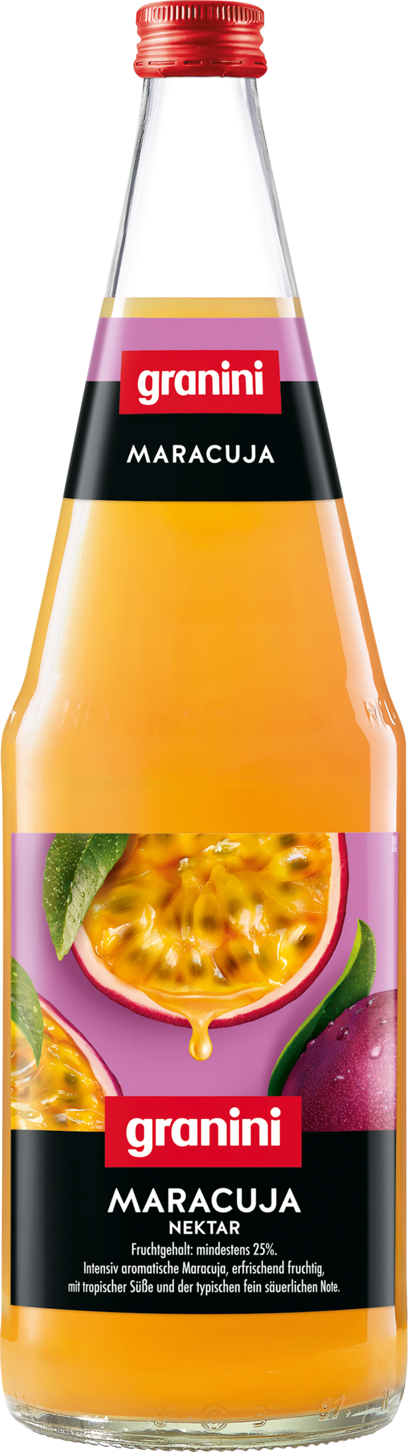 Ein subtiler Cocktail mit perfekter Balance und exotischen Noten. Fruchtgetränk, Maracuja-Vanille-Geschmack. Fruchtgehalt: mindestens 24%.