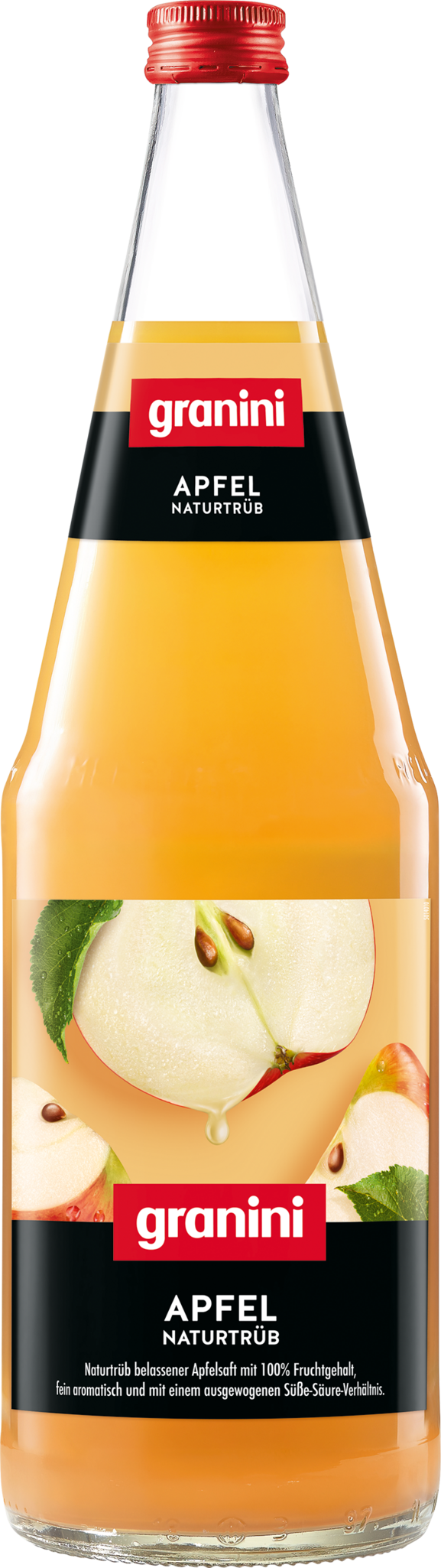 Spritziger Apfelsaft mit 100% Fruchtgehalt, kräftigem Aroma und feiner Säure.