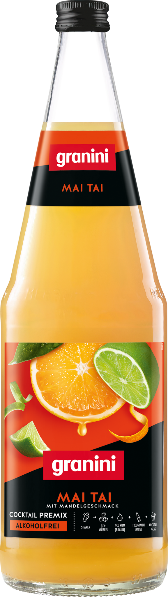 Die Sorte granini Mai Tai ist die perfekte Basis zur Herstellung einer der weltweit erfolgreichsten Rum-Cocktails. Einfach granini Cocktail Premixes Mai Tai sowie gewünschte Menge braunen Rum auf Eis shaken, in ein Cocktailglas geben und garnieren. Fertig ist der perfekte Mai Tai.