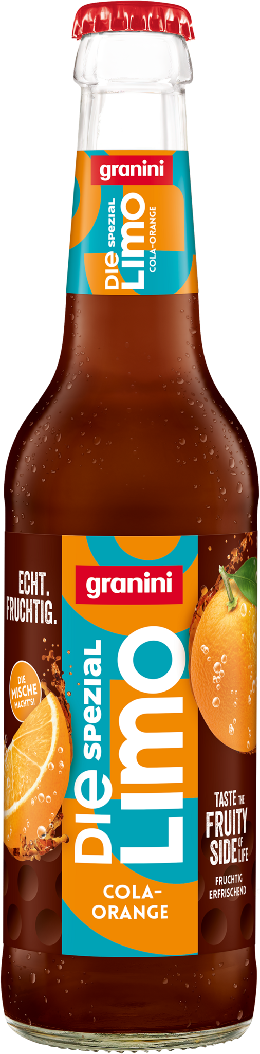 Endlich ist Limo nicht mehr nur süß, sondern erfrischt mit dem vollen Geschmack der Frucht! granini Die Limo ist besonders beliebt in Restaurants, Cafés, Bars und Clubs und wird in der Gastronomie in der modernen 0,33l Glasflasche in drei Sorten angeboten: Orange-Lemongras, Pink Grapefruit-Cranberry, Limette-Zitrone und unsere neue Sorte Cola-Orange.